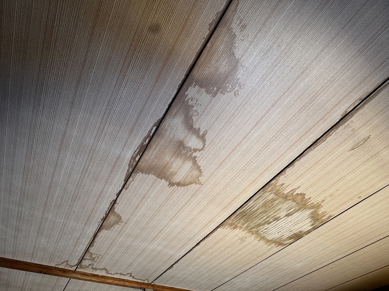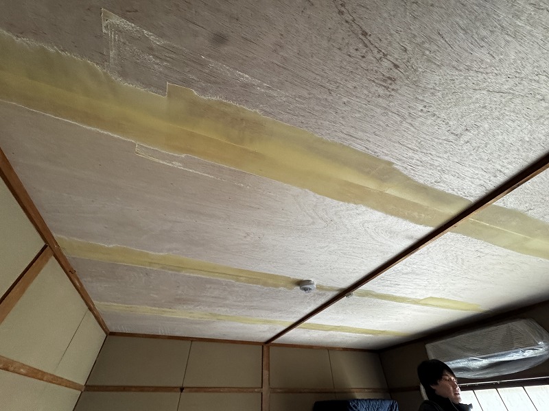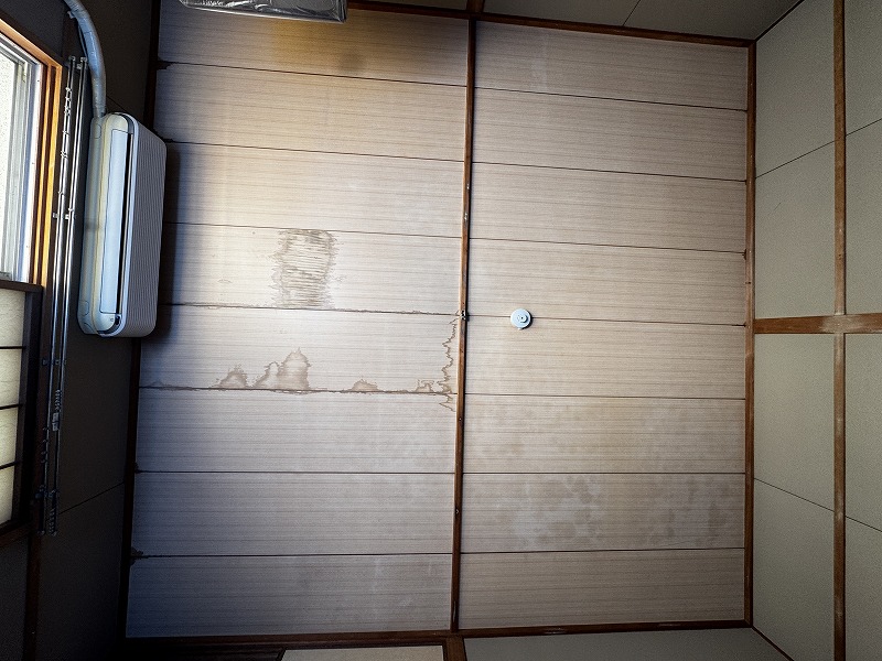 マンション上階からの漏水被害により、和室の天井にシミができたのでやり替えたいとご依頼頂きました。費用は押さえたいとの事でしたので、石膏ボードを張ってから和室天井柄のクロスを張りました。